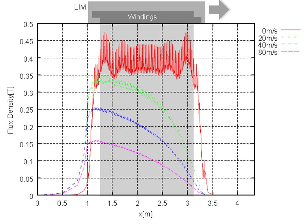 В такой модели образуются следующие составляющие магнитного поля. В зоне 2, которая соответствует обмотанной части ЛАД: главное магнитное поле представляет бегущее вдоль оси ОХ с синхронной скоростью поле и имеющее постоянную амплитуду индукции; прямая (бегущая вдоль положительного направления оси ОХ) волна магнитной индукции продольного краевого эффекта, затухающая по продольной координате по экспоненциальному закону; обратная волна магнитной индукции продольного краевого эффекта, бегущая в противоположном направлении оси ОХ и также затухающая по продольной координате согласно экспоненциальному закону. Прямые волны магнитного поля краевого эффекта затухают медленнее, чем обратные. В высокоскоростных ЛАД прямые волны полей, вызванных продольным краевым эффектом могут достаточно глубоко проникать в область 2, иногда даже проникая в область 4. Это определяет искажение результирующего магнитного поля в ЛАД, вызываемое продольным краевым эффектом, и заключающееся в уменьшении индукции и смещении пика кривой индукции к сбегающему краю индуктора в тем большей степени, чем ближе скольжение к нулю. Особенно резко этот эффект выражен в высокоскоростных ЛАД с высокой добротностью. Пример распределения магнитной индукции на поверхности РШ при различных скоростях движения для ЛАД транспортной системы HSST (Япония) представлен на Рис. 3 [11].