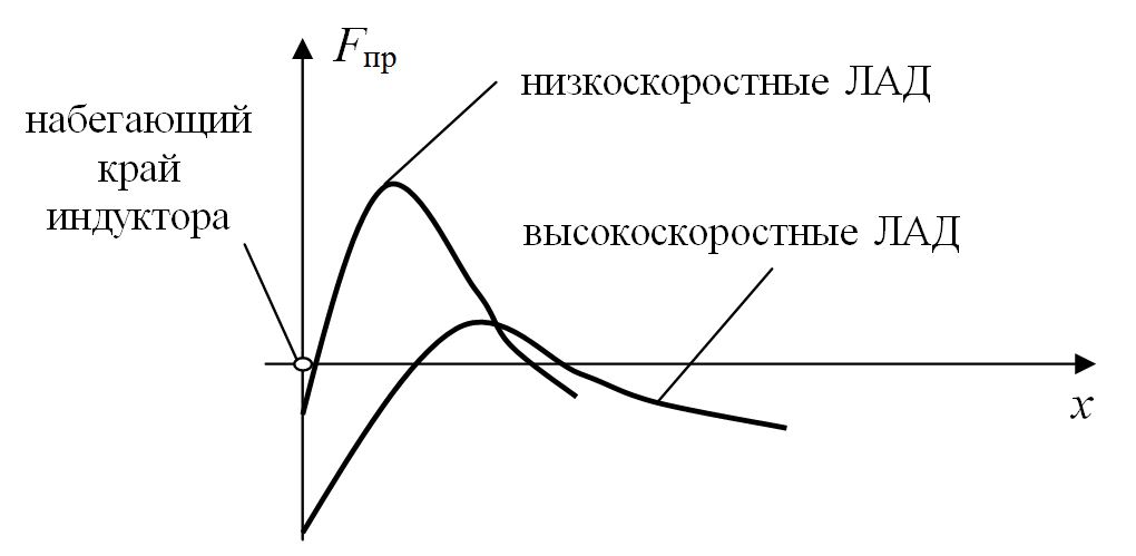 Рис. 4. Характер распределения электромагнитного усилия по продольной координате от прямой волны продольного краевого эффекта в низкоскоростных и высокоскоростных ЛАД