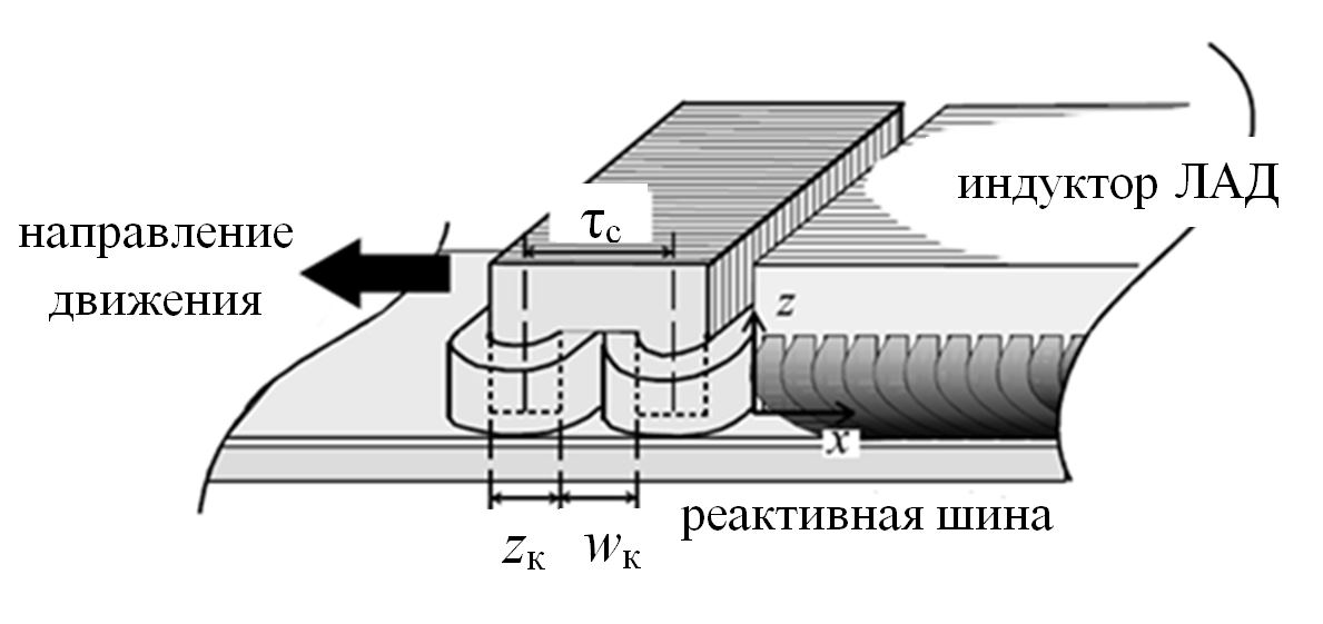 Плоские ЛАД могут быть выполнены с длинным ВЭ и коротким индуктором; такой вариант конструкции получил наибольшее распространение. В этом случае индуктор располагается на экипаже, а ВЭ – на путевом полотне. ВЭ ЛАД может иметь различные варианты конструктивного решения. Наиболее простой вариант – изотропная РШ, выполняемая из проводящего материала (алюминий или медь). Зачастую РШ выполняют из нескольких материалов (медная или алюминиевая шина со стальной подложкой) или в виде многослойной конструкции (медь-сталь-медь или алюминий-сталь-алюминий). РШ может быть выполнена монолитной или в виде решетчатой конструкции с выштампованными окнами, что упорядочивает распределение вихревых токов во ВЭ и несколько снижает влияние краевых эффектов. Возможно также применение ВЭ с обмоткой в виде беличьей клетки из медных стержней и торцевых короткозамыкающих проводников. Анализ различных вариантов конструкции ВЭ [2, 3] показал, что вариант медного ВЭ в виде "лестницы" или "беличьей клетки" наиболее эффективен, но этот вариант является более дорогим для широкого использования в транспортных системах, поэтому более целесообразен его алюминиевый аналог. Возможен вариант сложной конструкции ВЭ в виде комбинации сплошной центральной проводящей части и решетчатой проводящей конструкции по обеим сторонам от центральной части [4], обеспечивающей лучшую поперечную устойчивость экипажа.