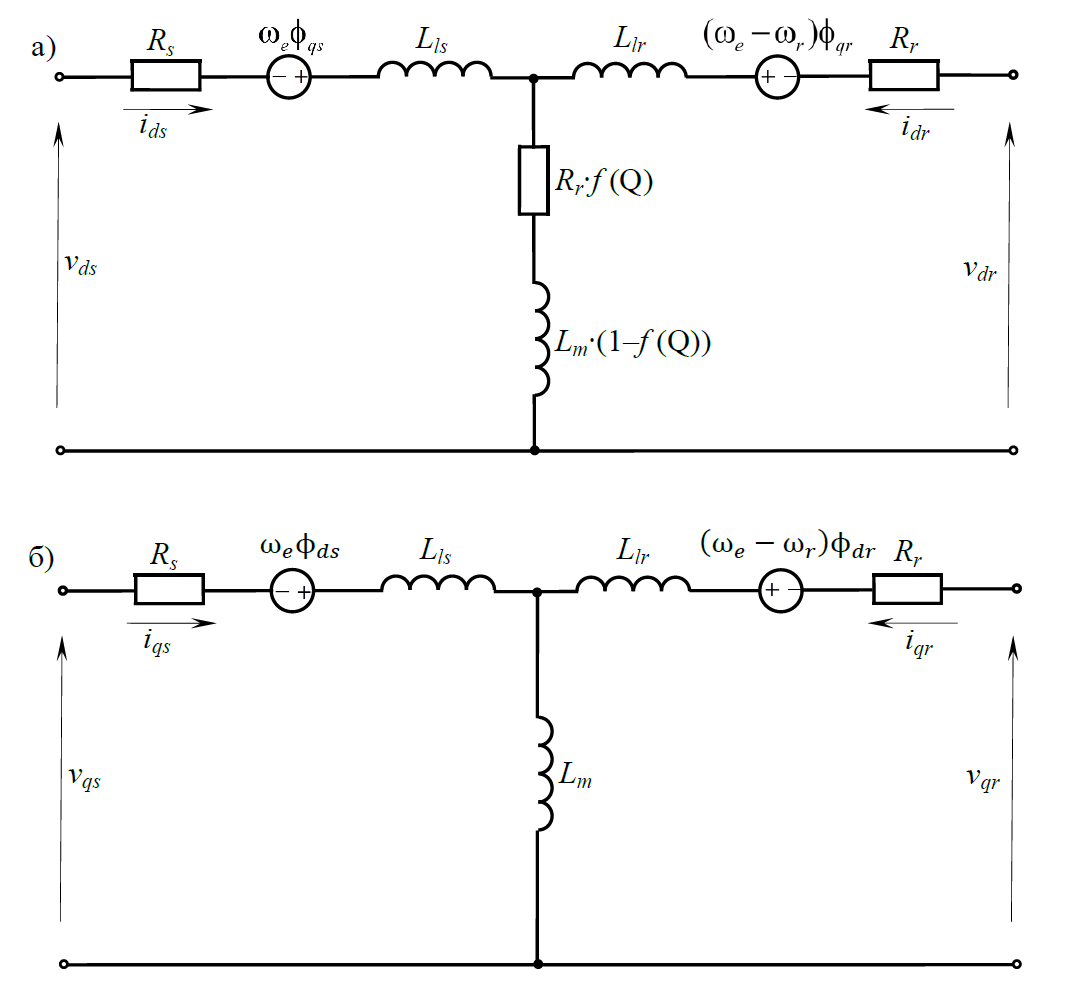 Рис. 9. Схема замещения ЛАД в d-оси (а) и q-оси (б)