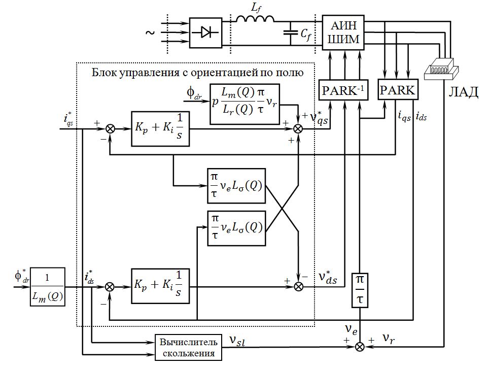 Один из возможных вариантов построения системы управления односторонним ЛАД на основе приведенных выше уравнений, реализующий непрямое управление с ориентацией по полю с учетом краевых эффектов, представлен в работе [24] (Рис. 10).