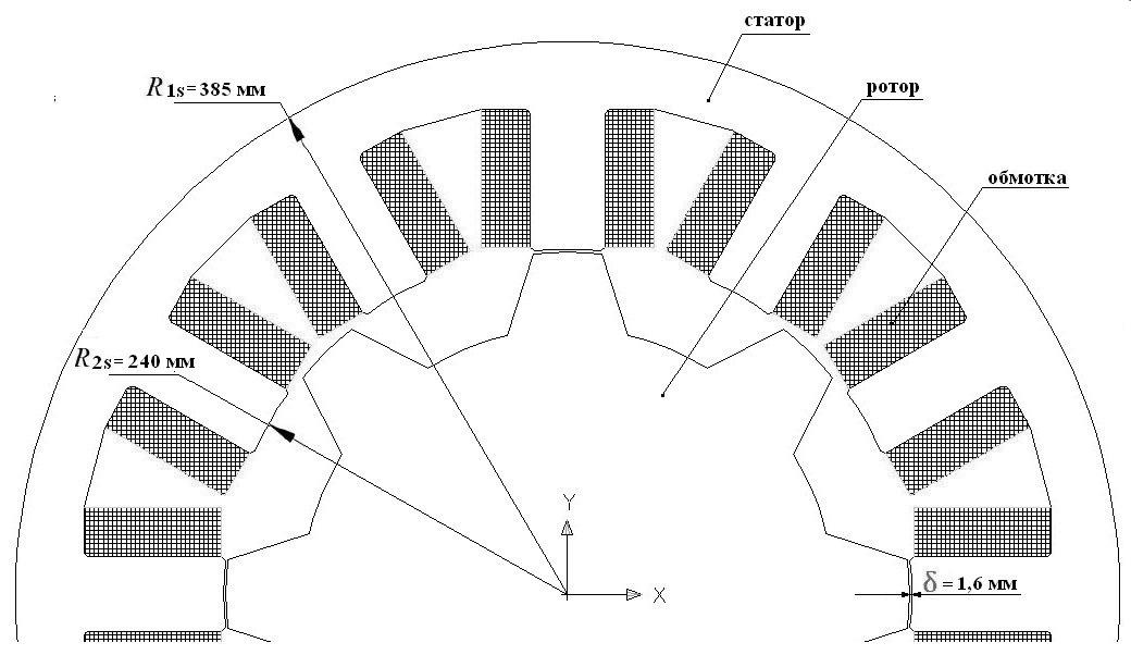 Мощность ВИД на валу соответствует Рном = 1300 кВт, частота вращения nном = 1766 об/мин, напряжение Ud = 2200 В. Рассмотрен номинальный режим работы при смещении ротора по радиусу относительно оси симметрии статора на 0,4 мм по оси Х и по оси Y на 0,4 мм.