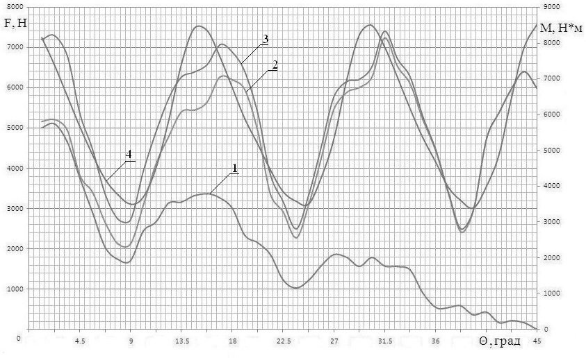 Затем фазный ток применяется в дальнейших расчетах в формате зависимости тока от угла поворота ротора i(θ). Определение сил ОМП осуществляется по тензору натяжений Максвелла в магнитном поле. Приняты ограничения и допущения: магнитное поле ВИМ является плоскопараллельным; за пределами магнитной системы ВИД поле отсутствует; взаимное влияние фаз не учитывается; вихревые токи не оказывают существенного влияния на распределение магнитной индукции. Полученные расчетные значения сил ОМП даны на Рис. 3.