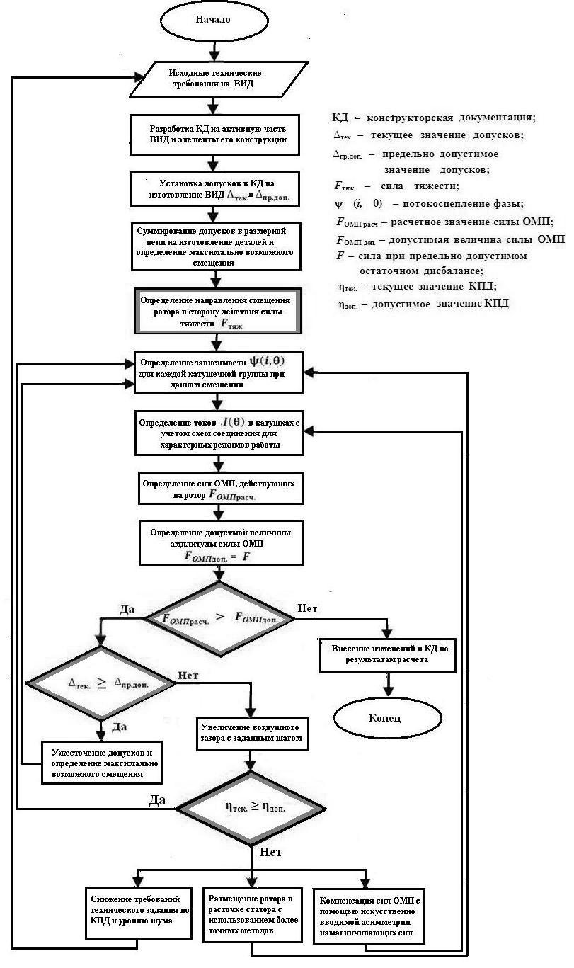 Следовательно, необходимо уточнить особенности производства ВИД с точки зрения обеспечения равномерности воздушного зазора. С этой целью предложен алгоритм расчета характеристик ВИД, учитывающий влияние сил ОМП, позволяющий внести изменения в технологию производства, гарантирующий работоспособность в течение длительного срока службы (Рис. 4).