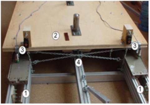 Рис. 1. Основные части макета: 1 – неподвижная путевая часть, 2 – подвижная левитирующая часть, 3 – измерительная структура, 4 – вспомогательное оборудование.
