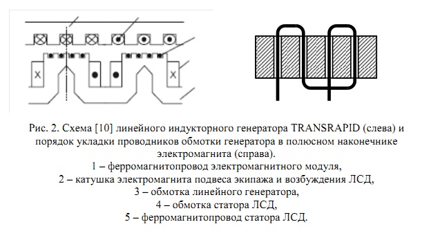 Рис. 2. Схема [10] линейного индукторного генератора TRANSRAPID (слева) и порядок укладки проводников обмотки генератора в полюсном наконечнике электромагнита (справа). 1 – ферромагнитопровод электромагнитного модуля, 2 – катушка электромагнита подвеса экипажа и возбуждения ЛСД, 3 – обмотка линейного генератора, 4 – обмотка статора ЛСД, 5 – ферромагнитопровод статора ЛСД.