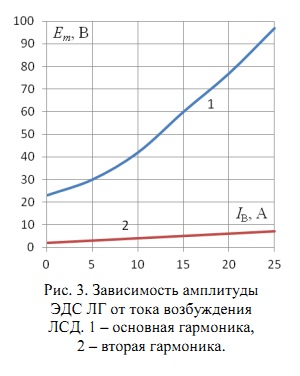 Анализ показывает [10], что амплитуда ЭДС ЛГ практически не зависит от тока статора ЛСД и характеризуется весьма малым содержанием высших гармоник (наиболее выражена вторая гармоника). При скорости 80 км/ч суммарная ЭДС десяти центральных магнитов ЛГ одного электромагнитного модуля экипажа TRANSRAPID достигает 450 В. Ток возбуждения ЛСД влияет на ЭДС ЛГ существенно: с ростом тока возбуждения ЛСД растет амплитуда основной гармоники ЭДС ЛГ. (рис. 3). Кроме этого, существенное влияние на амплитуду основной гармоники ЭДС ЛГ оказывает величина воздушного зазора (рис. 4).
