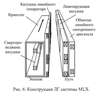 2. Линейный генератор MLX. Магнитолевитационная система MLX (испытательный полигон Яманаши, Япония) принципиально отличается от системы TRANSRAPID: тяговое усилие создается ЛСД с использованием сверхпроводящих магнитов, создающих поля с высокой индукцией. По этой причине в ЛСД отсутствует стальная зубчатая структура. Однако так же, как в системе TRANSRAPID, основным источником питания бортовых ПСН является линейный генератор.
