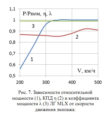 Рис. 7. Зависимости относительной мощности (1), КПД η (2) и коэффициента мощности λ (3) ЛГ MLX от скорости движения экипажа.