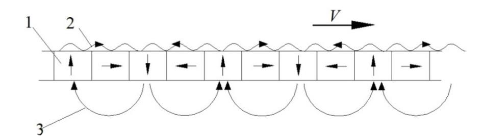 Рис. 1. Схематическое изображение простейшей сборки из постоянных магнитов:1 - простейшая сборка из постоянных магнитов; 2 – магнитное поле рассеяния; 3 – магнитное поле в рабочем зазоре