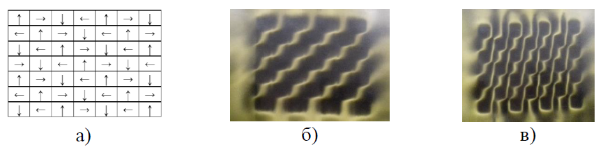 Рис. 2. Упрощенная сборка Хальбаха а) - схема сборки магнитов; б) - магнитные силовые линии рабочей стороны магнитного полюса; в) - магнитные силовые линии обратной стороны магнитного полюса