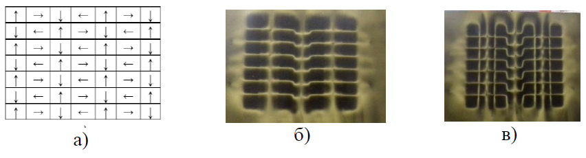 Рис. 3. Сборка №1 на основе массива Хальбаха а) - схема сборки магнитов; б) - магнитные силовые линии рабочей стороны магнитного полюса; в) - магнитные силовые линии обратной стороны магнитного полюса