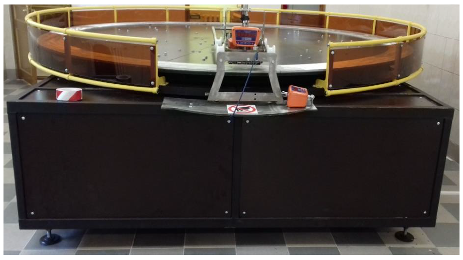 Стенд состоит из вращающегося диска диаметром 3 м, на котором крепится трековый модуль, изготовленный из сплошного листа алюминия толщиной 10 мм. Вращение обеспечивается двигателем, установленным под диском, мощностью 3,5 кВт.
