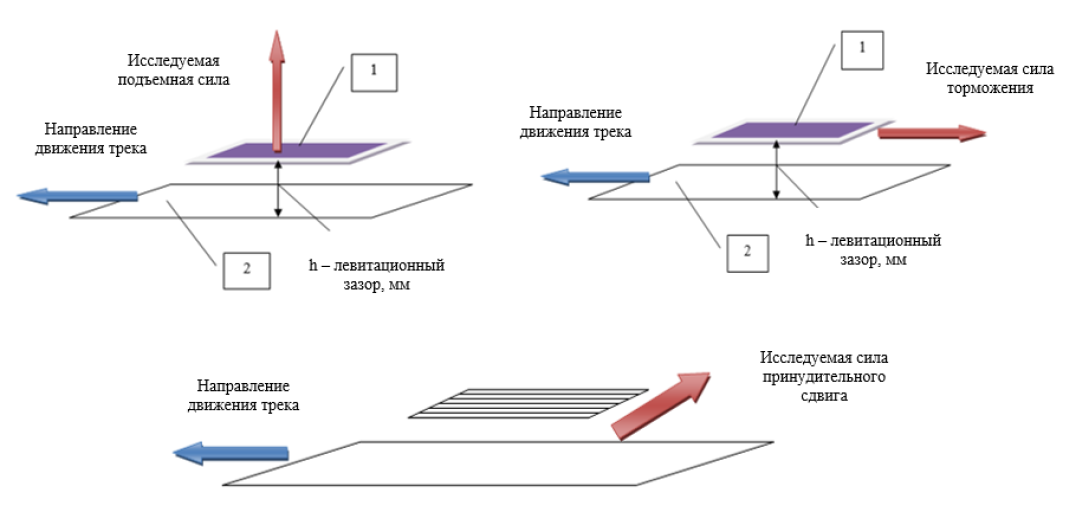Рис. 6. Схемы экспериментальных исследований 1 – исследуемая сборка магнитного полюса; 2 – трековый левитационный модуль