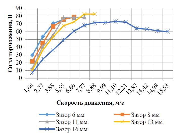 - При зазоре между трековым модулем и магнитным полюсом от 16 мм и выше наблюдается снижение сил сопротивления при достижении скорости движения 12 м/с;