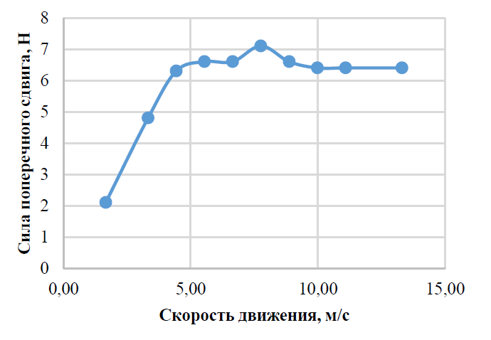 При увеличении скорости до 6 м/с наблюдается рост силы поперечного принудительного сдвига (рис.10). По достижении скорости 7,7 м/с и выше характеристика зависимости силы поперечного сдвига от скорости движения принимает пологий вид.
