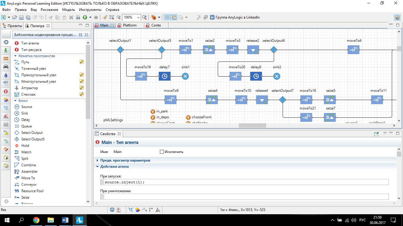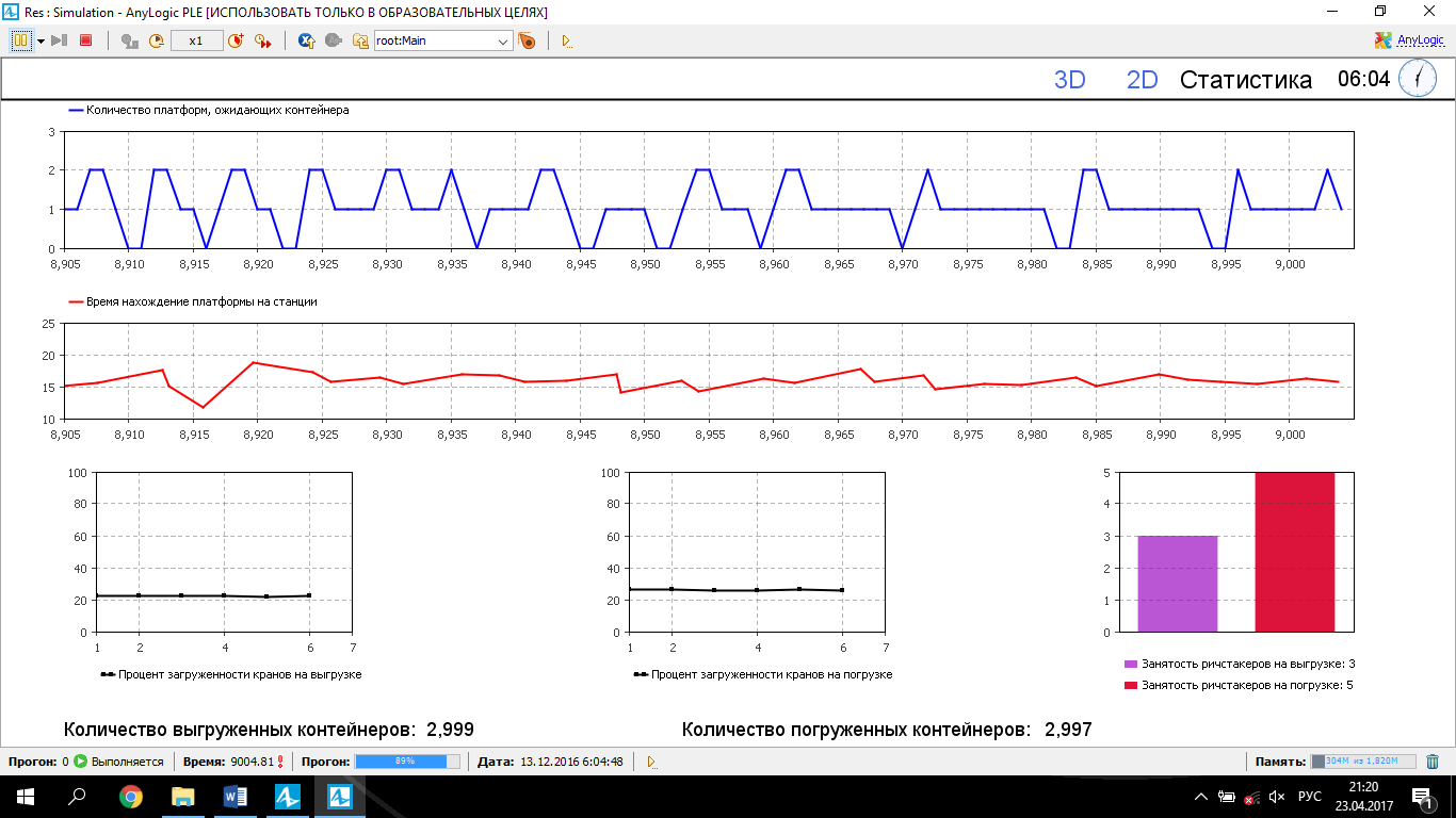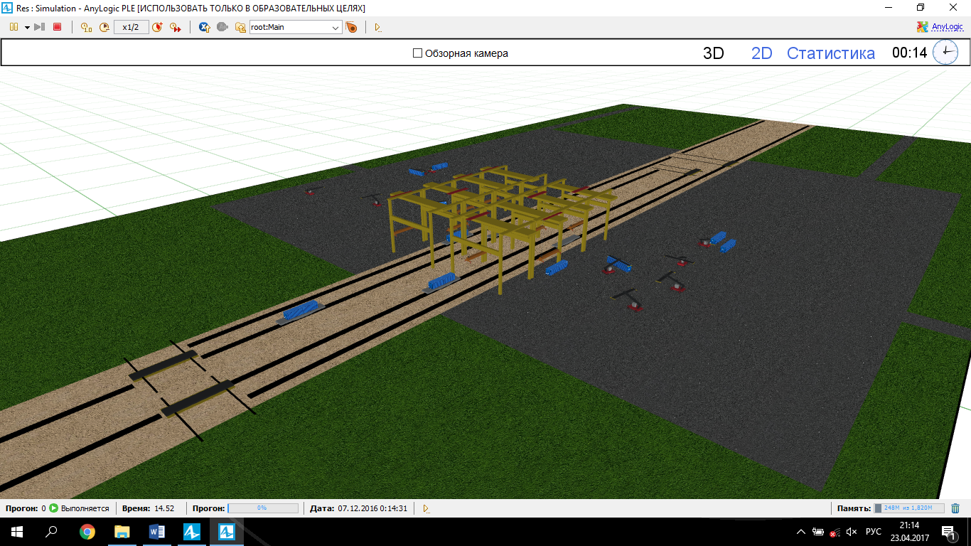 The scheme was taken into “the world of models” by means of the programme AnyLogic [12]. For simulation of this object, the agent-based and discrete-event approaches were used, which are suitable for simulation of transport systems. In the model, there are 2D and 3D windows (pic. 3) and also a window for collection of statistics (pic. 4).