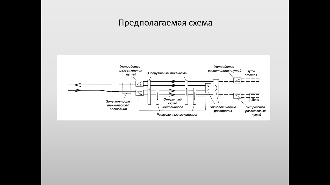 The picture 2 shows scheme of terminal processing of maglev platforms carrying containers. Common variant of the technology of terminal performance without considering buffer zones (terminal depots and refuge siding) consists of three stages: