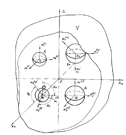 Постановка задачи. Пусть имеется ограниченная полной координатной поверхностью оболочка , внутри которой расположены неподвижно источники ЭМП (- рис. 2 в виде тел, ограниченных также полными координатными поверхностями с координатой (в центрах систем координат источников).