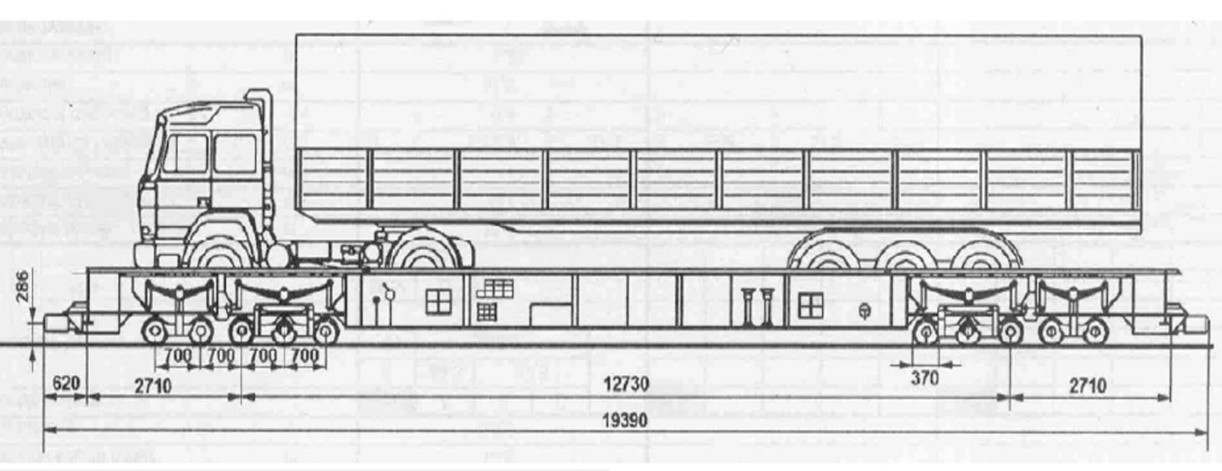 During the loading operation, the tractor unit hauls the trailer on to the special movable pallet, which is located along the rolling stock, and parks it. The trailer is fixed firmly on the pallet, and the tractor unit uncouples and leaves the pallet. Then, the pallet is set on the platform and fixed (fig. 14).