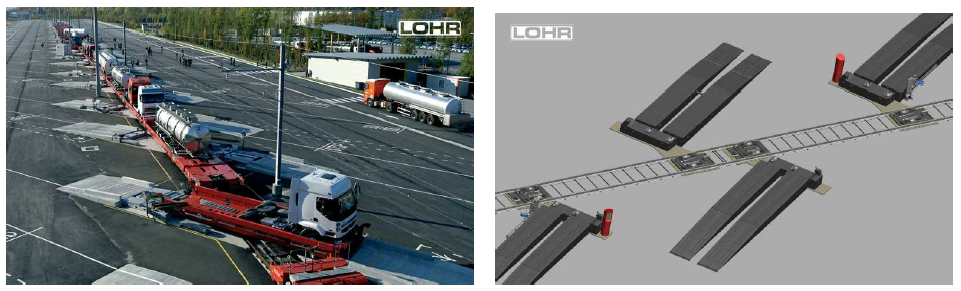 The Modalohr terminal consists of an even area and does not require high costs for equipment (fig. 6). The rails are embedded in the road surface, the ramps ensure loading and unloading of transport from both sides of the track. Before loading and unloading operations, hydraulic opening system drives rollers and jacks which lift the movable deck to the level of the floor of the wagon and swing it.
