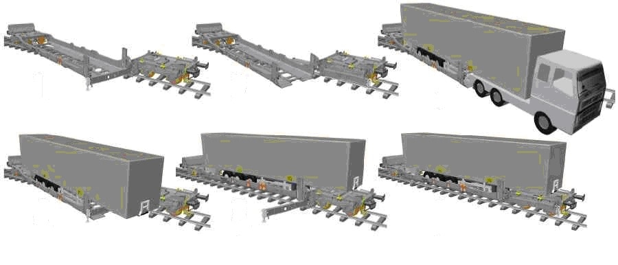 The terminal of this technology is equipped with rails attached to the parking lot, and with tractors for pulling lorries. Beginning from the end of the train, one by one trailers are attached to the bogie, with the lorries lifting by virtue of their own electric traction. After all the roadrailers are connected together, the bogie is installed in front of the stock which is links the entire system with the locomotive. Since there is no flat wagon, the rolling stock is much lighter than the conventional one. At the destination point, the system is easily disassembled, with the trailers placed in the parking place to be collected by tractor units.