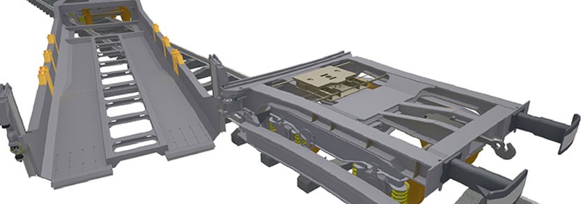 The expense for terminal infrastructure at this method of transportation is minimal. The terminal consists of an even railway track with the length equal to that of the train’s, and an endloading ramp. The gaps between the wagons are covered by drop-back shields for unhindered passage of the trailer trains to the end of the rolling stock. Using this shield enables loading another trailer unit between the platforms which makes the entire trailer train longer than the platform (the standard length of the flat wagon by the deck is 13 300 mm).