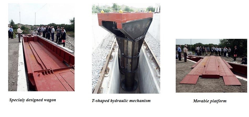 The technology means that there is a T-shaped hydraulic mechanism between the tracks, which lifts up the platform of the wagon. The mechanism lifts the deck of the platform to the ground level and pivots it so that there is a possibility to conduct loading on it. Thus, the trailer’s loading and unloading operations take place.