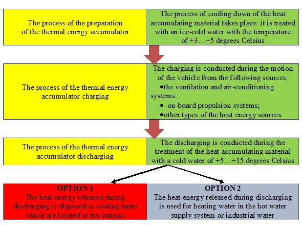 The fig. 3 shows the enlarged scheme of the operation process of thermal energy accumulator, which not only enables removing heat emissions inside the transport unit, but also utilising this thermal energy.