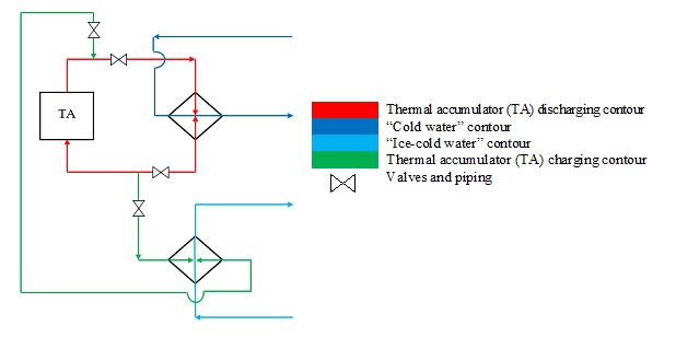 The fig. 4 shows the scheme of the option № 2 of beneficial use of the thermal energy emitted during discharge of the thermal accumulator. The option which predisposes removing thermal energy (Option № 1), differs from the proposed one in including tank cooler in the contour of “cold water”.