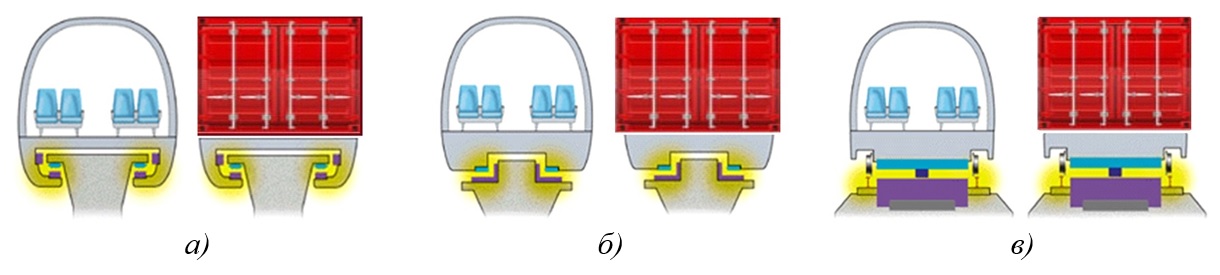 The combined suspension | Different options of design with the use of electromagnets, permanent magnets, different types of linear motors (synchronous, asynchronous, etc.) are achievable | |