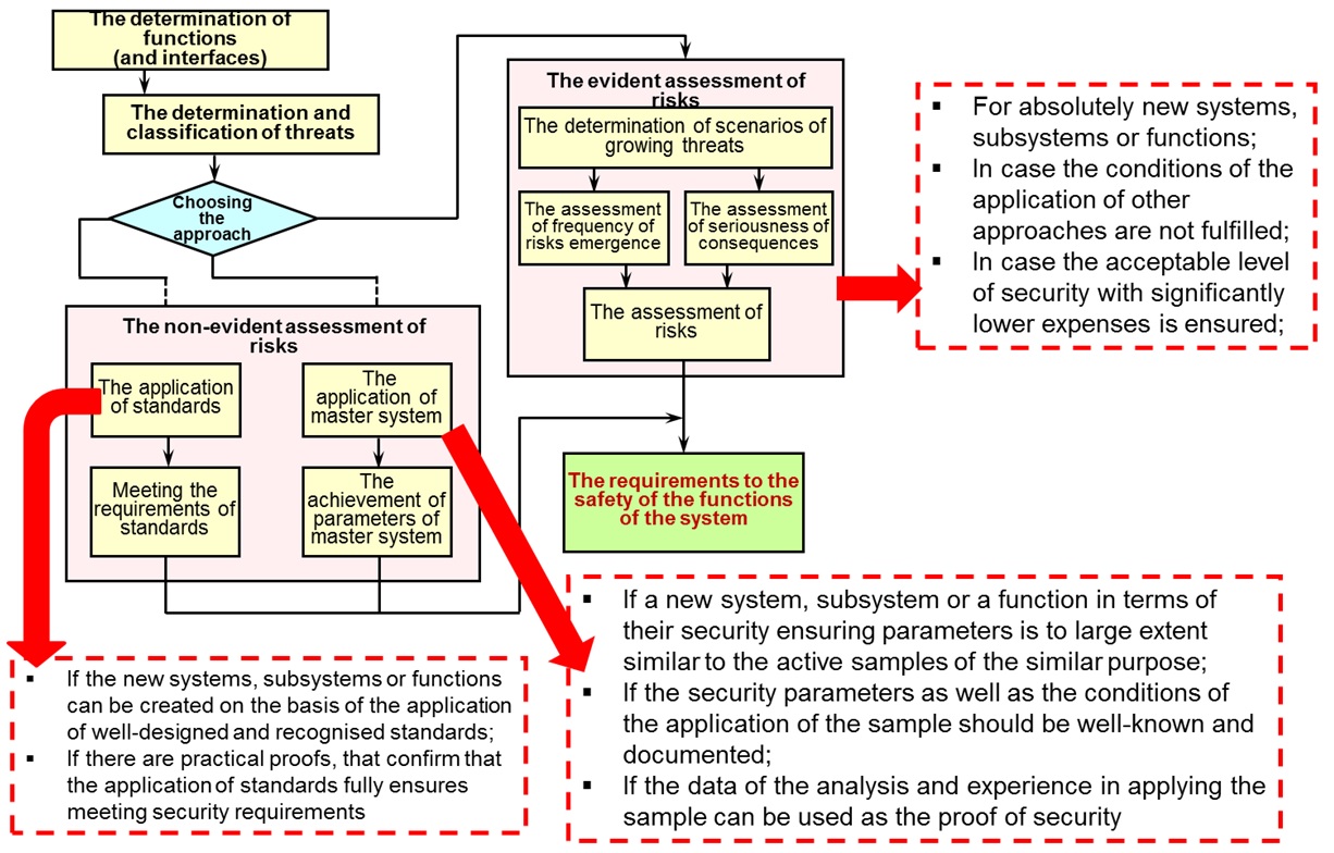 The applied filling of these management systems is carried out in accordance with the life cycle of the guided transport, specified in EN 50126 (IEC 62278 [11]), EN 50128 (IEC 62279 [12]) и EN 50129 (IEC 62425 [13]), as well as in IEC 60300-3-3 [14]. At the same time, regarding safety, the stage of the risk analysis has the crucial significance [15], which determines the risks in traffic safety, transport safety (protection against unlawful interference), occupational and environmental safety. Then the risk associated with them is assessed, and in case there is need to decrease this risk, the additional security functions are determined (fig. 3). With the reference to transport safety, at this stage the measures of pre-emptive (prevention), timely (prompt actions) and emergency (minimisation of damage) actions are taken against unlawful interference in accordance with the chosen model of behaviour of the potential intruder.